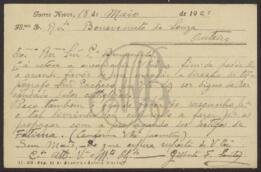 Bilhete postal de Gilberto Fernandes dos Santos (1892-1964), comerciante em Torres Novas, a solicitar o contacto do Sr. Pacheco (tipógrafo). Pede ainda o rascunho para se fazer um livro ou opúsculo para se divulgar juntamente com os artigos de Fátima.
