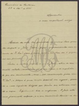 Carta do Cónego Francisco Maria Félix (1874-19?), reitor do Seminário de Santarém, a explicar ao Pe. Benevenuto a exclusão do seu primo João Vieira do referido seminário.