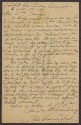 Correspondência do Pe. João Ferreira Fontes, do Instituto Nuno Álvares. No bilhete postal aborda a sua indisponibilidade para fazer Exercícios Espirituais, a pedido do Pe. Benevenuto; informa-o da possível comemoração dos 25 anos de sagração episcopal de D. Manuel Vieira de Matos, arcebispo de Braga, em finais de Outubro. As cartas abordam os seguintes assuntos: conferências de Lisboa, ocorridas em finais de Novembro de 1924; modelo da petição, em latim, que deverá dirigir ao Santo Padre para obter autorização de ter oratório privado; agradecimento pelas felicitações dadas pelo Pe. Benevenuto sobre as conferências que proferiu em Lisboa, no final de 1926.