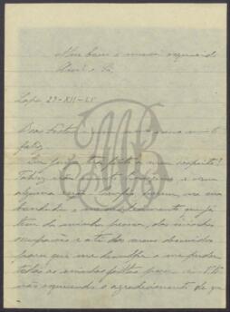 Carta do Pe. Francisco Pinto Ferreira, reitor do Santuário de Nossa Senhora da Lapa, na qual aborda vários assuntos: envio das boas festas; desculpa-se pelo atraso em responder ao postal de 7 de Agosto remetido pelo Pe. Benevenuto; refere a celebração de uma missa pelas melhoras da sua mãe, D. Rita de Sousa; fala-lhe da ligação da estrada da Caria ao Senhor dos Aflitos; do Congresso Mariano de Braga e de como gostaria de apresentar uma comunicação sobre o Santuário da Lapa; envio, numa carta anterior, de exemplares da sua obra intitulada "Trovas, duas novenas e duas graças", e nesta carta, de duas medalhas de Nossa Senhora.